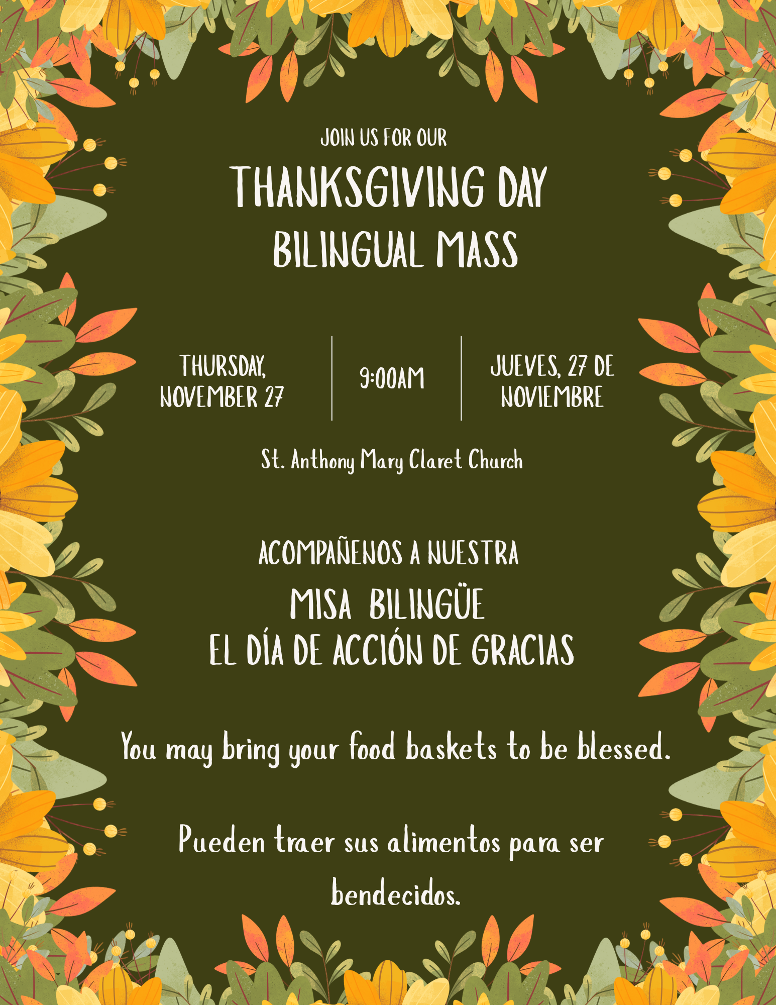 - There will be a CHANGE OF TIME SCHEDULE for the 1 PM Spanish Mass. Starting Sunday, November 9th, the Mass previously scheduled for 1:00 PM will now begin at 1:15 PM. Please be guided accordingly.