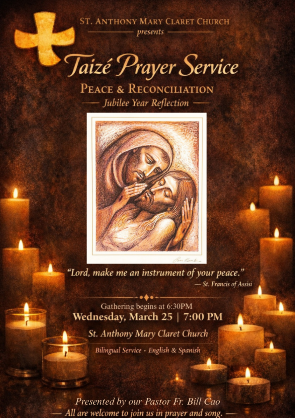 Saint Anthony Mary Claret Church, a diverse and welcoming Catholic community, is committed to continuing the ministry of Jesus Christ through Prayer, Sacraments, Evangelization, and Service.