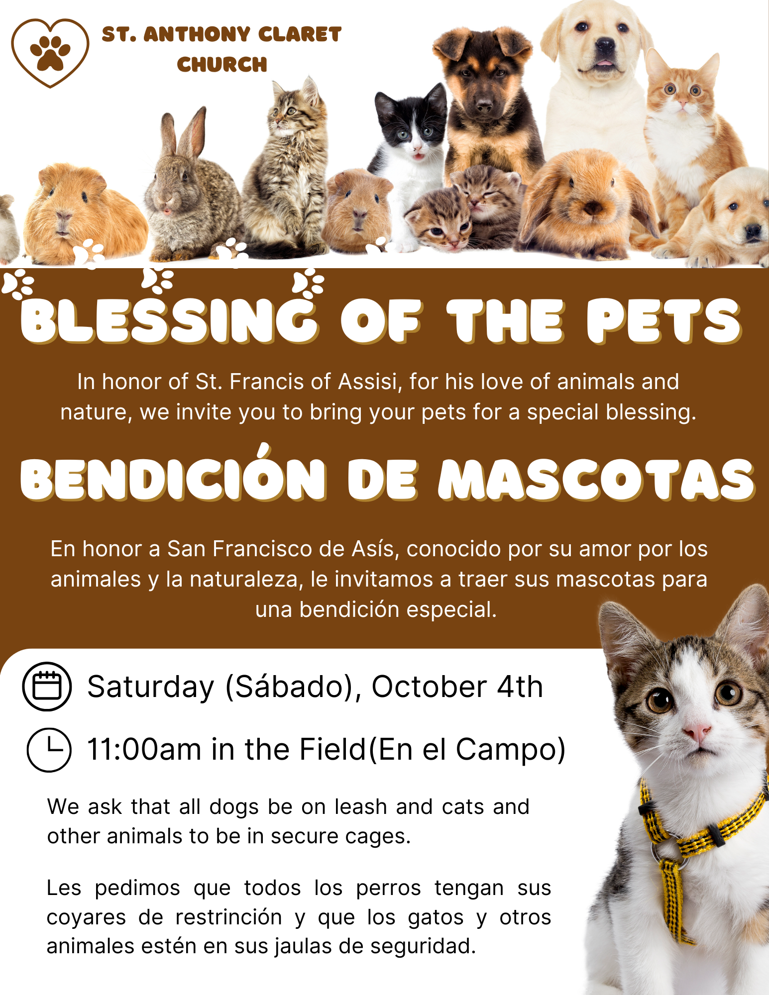 En honor a la Fiesta de San Francisco de Asís, conocido por su amor por la creación y la naturaleza, estan invitados a traer sus mascotas para una bendición especial el sábado, 4 de Octubre a las 11 de la mañana en el campo. Les pedimos que todos los perros tengan sus coyares de restrinción y que los gatos y otros animales estén en sus jaulas de seguridad.