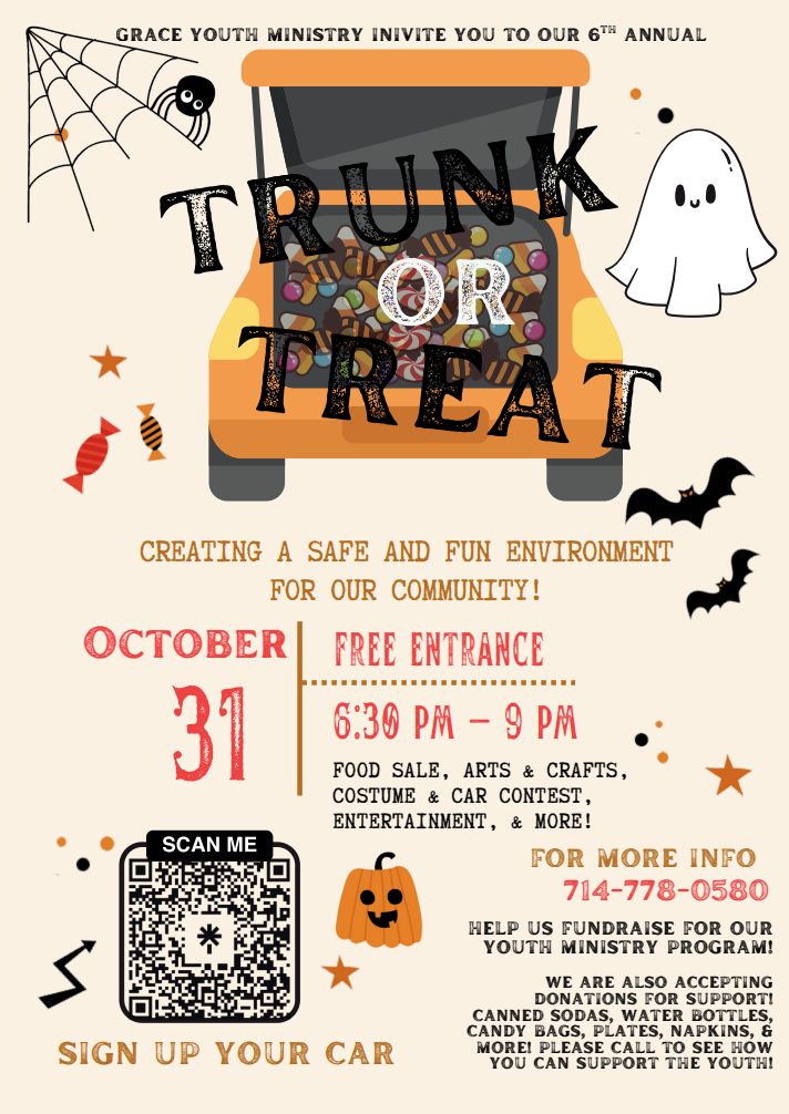El Ministerio de Jóvenes “Grace” los invita a un “Trunk or Treat” familiar, seguro y agradable el viernes, 31 de octubre de 6:30pm a 9:00pm en el estacionamiento. Habrá venta de comida, artesanías, concurso de disfraces, concurso de autos, entretenimiento y más. Todos los fondos recaudados de la venta de comida serán para el programa de ministerio juvenil.